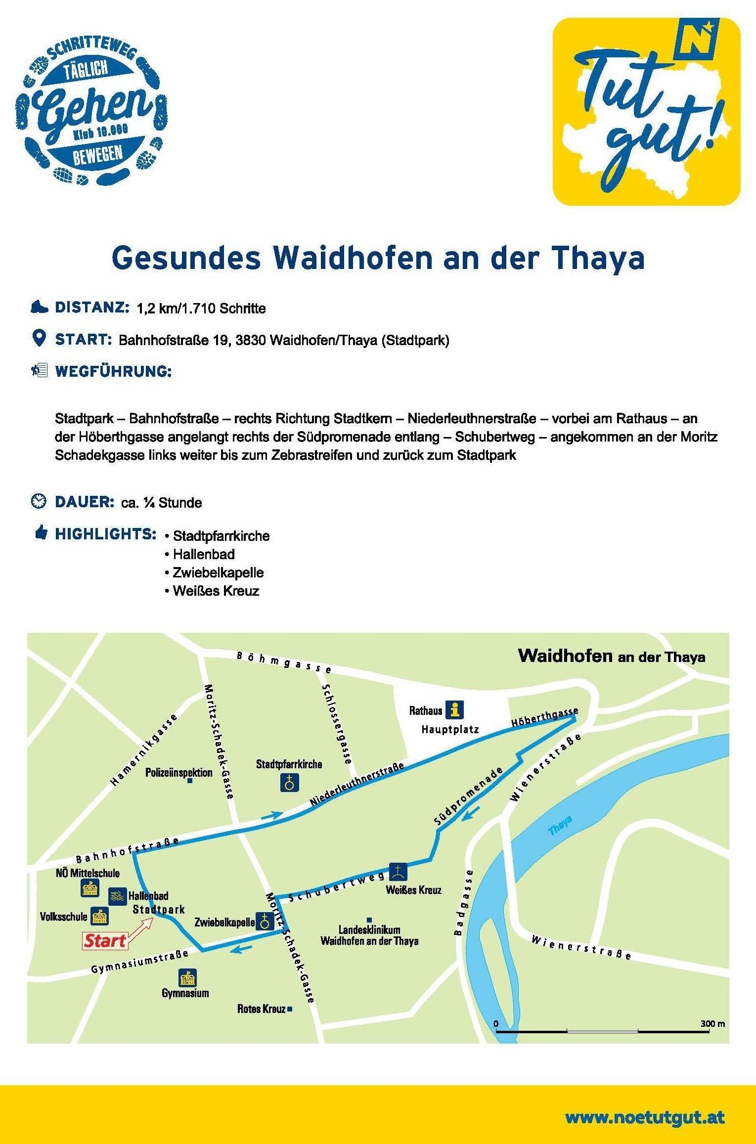 Mobil zu bleiben, heißt auch, nachhaltig etwas für die eigene Gesundheit zu tun. „Tut gut!“-Schrittewege eignen sich ideal, um das persönliche Schritte-Konto einfach, schnell und ohne großen Aufwand täglich zu erhöhen. Niederösterreichweit gibt es bereits mehr als 200 solcher Spazierwege – natürlich auch einen in Waidhofen an der Thaya.